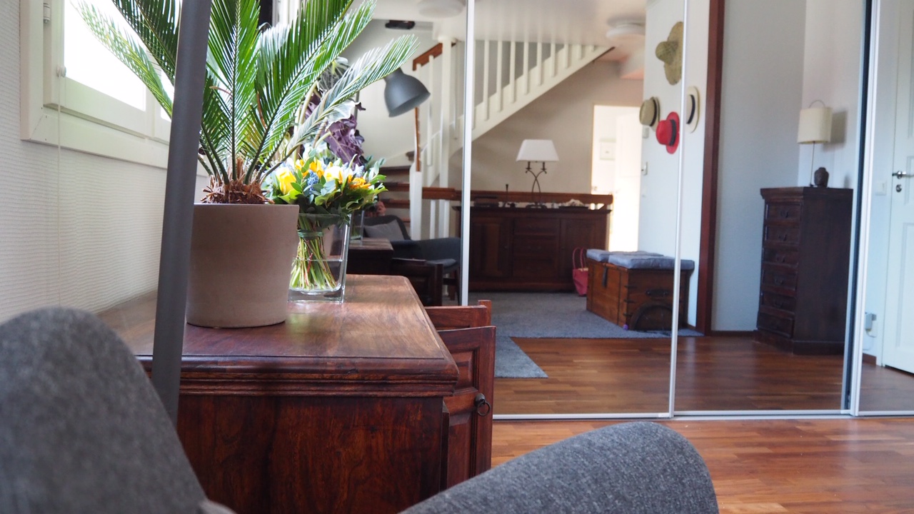 Huonekalut ovat vanhoja, eri puolilla kotiamme olleita. Nyt ne kerättiin samaan tilaan, jolloin koko huone sai vähän sellaisen siirtomaahenkisen, rustiikin fiiliksen. Ja huonekalut saivat uuden elämän, sillä olin niihin jo vähän kyllästynyt. Olin vähän haikaillut eteiseen uusia, rottinkisia kalusteita, mutta ekologisempaahan tämä on, että pärjäämme vanhoilla.